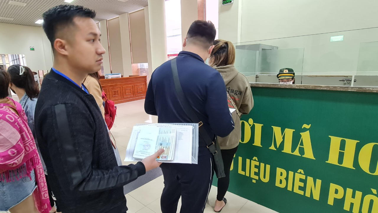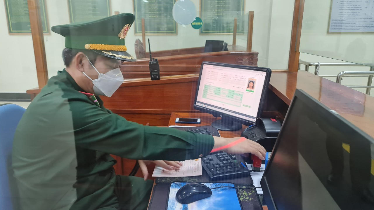 Cán bộ Biên phòng Cửa khẩu quốc tế Móng Cái kiểm tra làm thủ tục cho người dân qua lại tại cửa khẩu.
