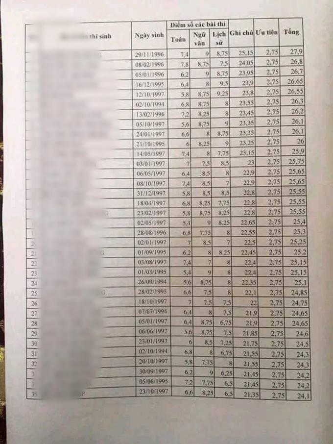 Những ngày qua, mạng xã hội lan truyền bảng điểm của 35 thí sinh thi THPT quốc gia 2018 tại Lạng Sơn. Theo đó, môn Lịch sử có bốn em được 9 điểm, 21 em được 8. Môn Ngữ văn có năm thí sinh điểm 9 và 23 em được 8-8,75. Không thí sinh nào trong danh sách có tổng điểm ba môn Ngữ văn, Toán, Lịch sử và điểm ưu tiên dưới 24. Các thí sinh sinh năm 1994 đến 1997.