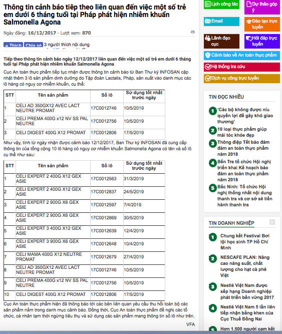 Ngày 20/1, Cục An toàn thực phẩm, Bộ Y tế tiếp tục có cảnh báo, ngay sau khi nhận được thông tin cảnh báo từ Ban thư ký INFOSAN về việc có thêm 99 lô sản phẩm dinh dưỡng của Tập đoàn Lactalis (Pháp) phải thu hồi vì có nguy cơ nhiễm khuẩn Salmonella.