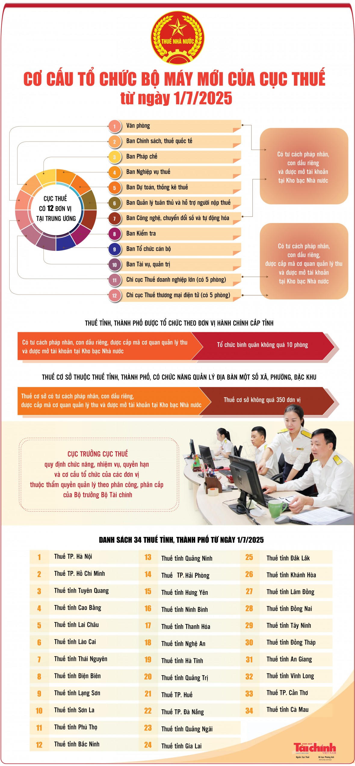 Song song với việc tinh gọn cấp trung ương, hệ thống thuế tại địa phương cũng được quy hoạch rõ ràng. Toàn quốc sẽ có 34 Cục Thuế cấp tỉnh, thành phố, chịu trách nhiệm quản lý toàn diện trên địa bàn. Các Cục Thuế này được tổ chức theo đơn vị hành chính cấp tỉnh, đảm bảo sự bao phủ và quản lý chặt chẽ.