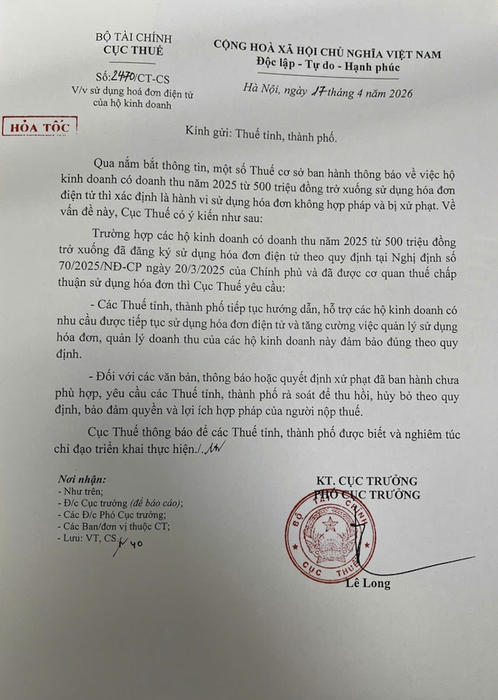 Chiều 17/4, Cục Thuế ban hành công văn hỏa tốc số 2470/CT - CS do Phó Cục trưởng Lê Long ký, gửi các thuế tỉnh, thành phố về việc sử dụng hóa đơn điện tử của hộ kinh doanh, sau khi phát hiện một số địa phương áp dụng sai quy định, gây thiệt hại cho người nộp thuế.