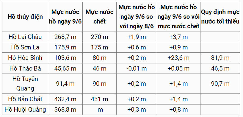Nhìn chung, mực nước các hồ thủy điện đa mục tiêu miền Bắc (Lai Châu, Sơn La, Bản Chát, Huội Quảng, Tuyên Quang) đã có sự cải thiện so với ngày 8/6, tuy nhiên vẫn vẫn xấp xỉ mực nước chết, không huy động được khoảng 5.000MW, riêng mực nước hồ thủy điện Sơn La tăng 1,9m so với ngày 8/6, hồ Hòa Bình còn cách mực nước chết 23,6m.