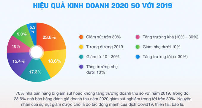 Theo kết quả khảo sát thường niên của Sapo, 2020 là một năm khó khăn đối với những nhà bán hàng, đặc biệt trong các ngành dịch vụ ăn uống, lưu trú, nghỉ dưỡng. Số liệu thống kê trên 10.000 nhà bán hàng tham gia khảo sát cho thấy, 70% nhà bán hàng cho biết doanh thu bị giảm sút hoặc không tăng trưởng so với năm 2019.