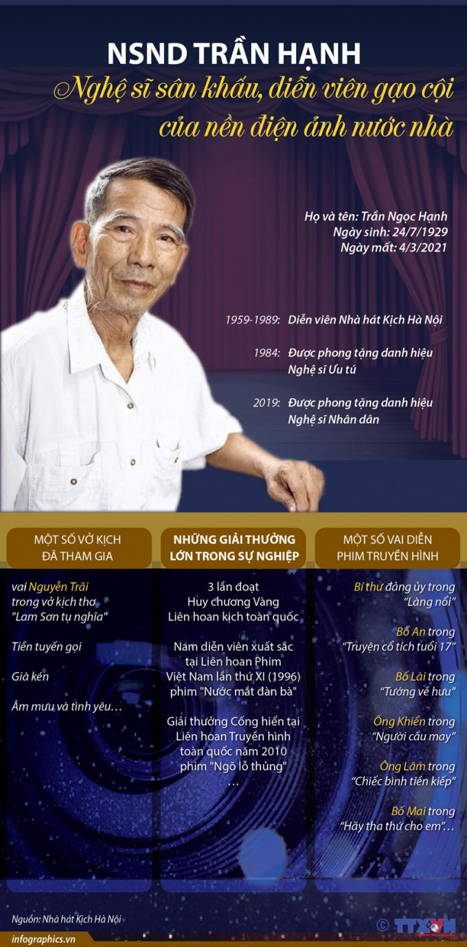 Nghệ sỹ nhân dân Trần Hạnh qua đời sáng ngày 4/3 ở tuổi 92. Ông là nghệ sỹ sân khấu, là diễn viên gạo cội của nền điện ảnh Việt Nam.