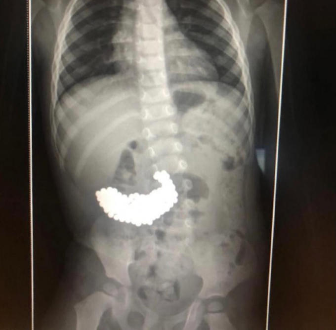 Sau khi chụp X-quang, các bác sĩ vô cùng sốc phát hiện nhiều vật thể kim loại bên trong dạ dày của cậu bé, theo cậu bé này cho biết những viên bi này vào bụng từ 2 tháng trước đó từ một loại đồ chơi cậu từng chơi.