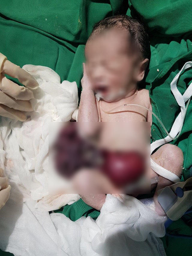 Dị tật bẩm sinh khiến toàn bộ nội tạng đứa trẻ bị lòi ra ngoài. May mắn bệnh nhi đã được các bác sĩ phẫu thuật cứu thành công.