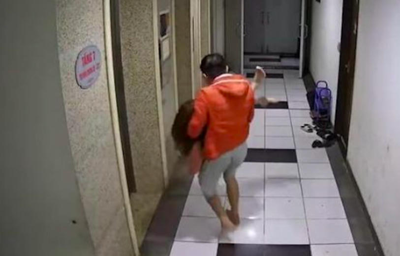 Đối tượng Sơn bế vợ đi cấp cứu sau đó bỏ trốn (Hình ảnh được camera an ninh toà nhà ghi lại).
