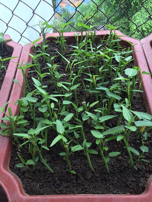 Đối với việc làm đất, chị trộn đất phù sa với hỗn hợp mùn trấu hun, trấu sống và mùn dừa, phân gà. Riêng hạt giống, chị đặt mua và tự gieo nảy mầm. Cây ra 6 lá, chị tách chúng sang chậu nhỏ để sinh trưởng tốt hơn.