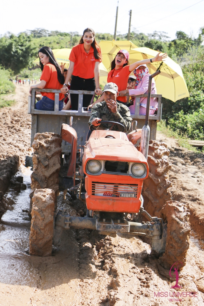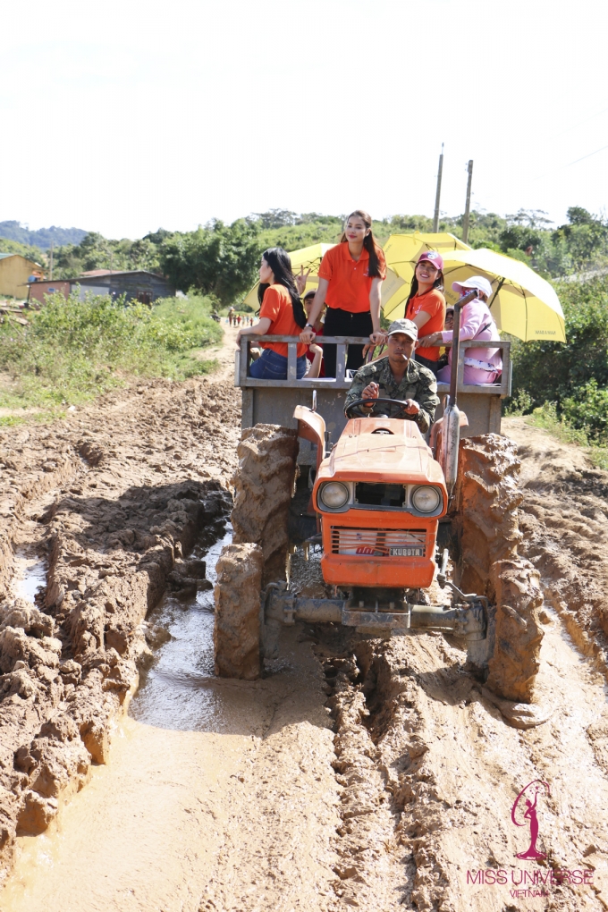 Địa hình hiểm trở, rất khó khăn để di chuyển nhưng được sự giúp đỡ của người dân địa phương, các người đẹp đã có dịp trải nghiệm cảm xúc rất đáng nhớ khi phải “cưỡi máy cày” để đến với lớp mẫu giáo của các em người dân tộc trường K’Long Bong.