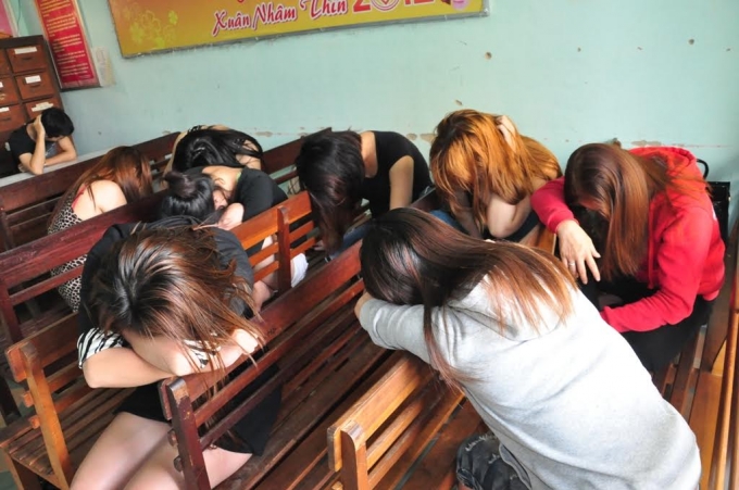 | Các đối tượng bán dâm bị bắt và đưa về trụ sở cơ quan công an. |