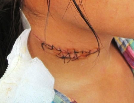 Sau khi hành hung vợ, anh Luận cầm dao tự cứa vào cổ mình để tự sát. Con của hai người phát hiện sự việc đã kêu gọi hàng xóm tới đưa đi cấp cứu.
