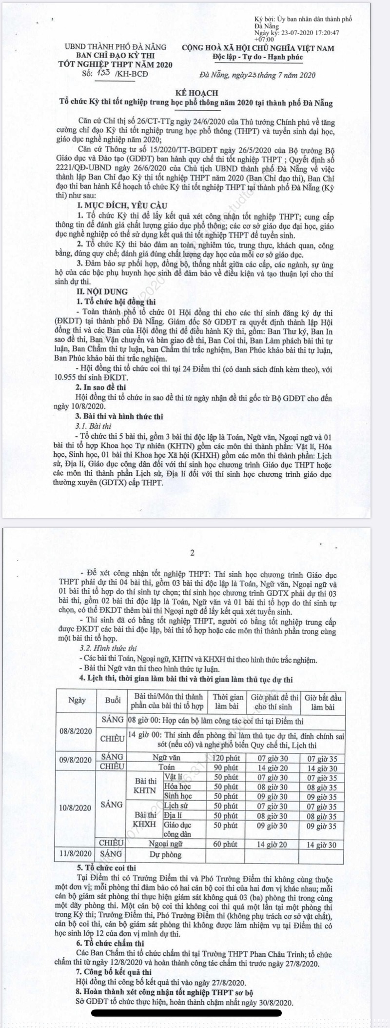 Ngày 27/7, ông Lê Trung Chinh, Phó Chủ tịch UBND thành phố, Trưởng ban Ban Chỉ đạo (BCĐ) Kỳ thi Tốt nghiệp THPT TP. Đà Nẵng đã ký ban hành kế hoạch cụ thể về việc tổ chức Kỳ thi tốt nghiệp THPT trên địa bàn, đảm bảo phòng chống dịch.