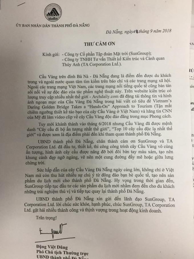 “UBND TP Đà Nẵng, chân thành cám ơn SunGroup và TA Corporation Ltd. đã đầu tư, thiết kế, thi công công trình cây Cầu Vàng vô cùng ấn tượng, hình ảnh cây cầu được nâng đỡ bởi đôi bàn tay màu xám, tạo nên khung cảnh đẹp ngỡ ngàng, vẽ nên một cung đường đầy mê hoặc giữa lưng chừng trời.