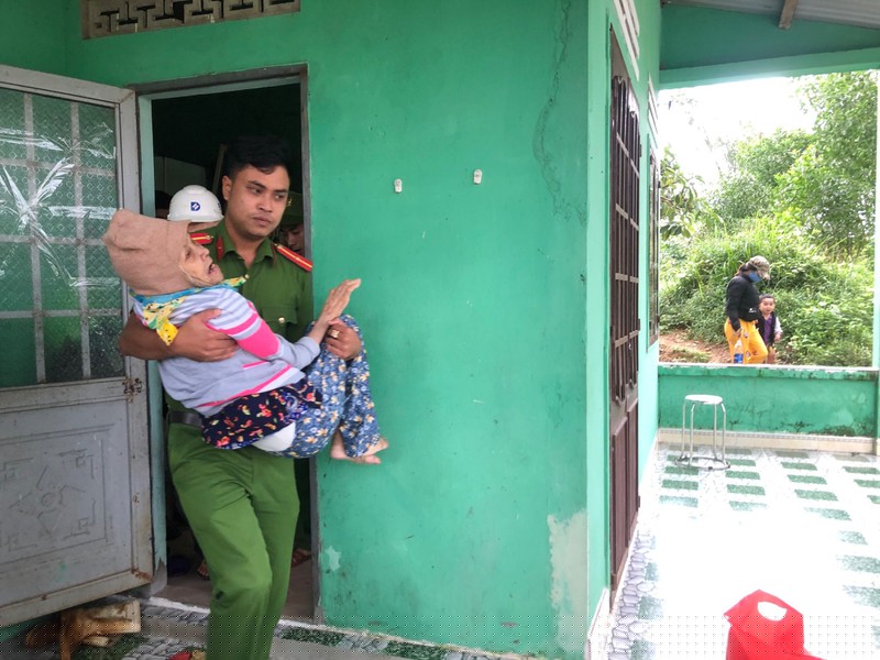 Công an xã Hòa Ninh vận động dân đang ở dưới chân núi đi di tản...