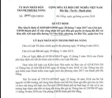 Nội dung Quyết định 5443/QĐ-UBND nêu trên là hủy kết quả đấu giá quyền sử dụng đất khu đất A20 mặt tiền đường Võ Văn Kiệt, phường An Hải Tây, quận Sơn Trà, đối với Công ty CP VIPICO (địa chỉ TT12-C20 Khu đô thị mới Văn Quán, quận Hà Đông, TP Hà Nội) do công ty này không thực hiện đúng theo cam kết tại Phiếu đăng ký tham gia đấu giá, phương án đấu giá tại Quyết định 1228/QĐ-UBND ngày 07/3/2016 của UBND thành phố Đà Nẵng và Quy chế của cuộc bán đấu giá; đồng thời thu tiền đặt cọc nộp vào ngân sách nhà nước theo quy định.