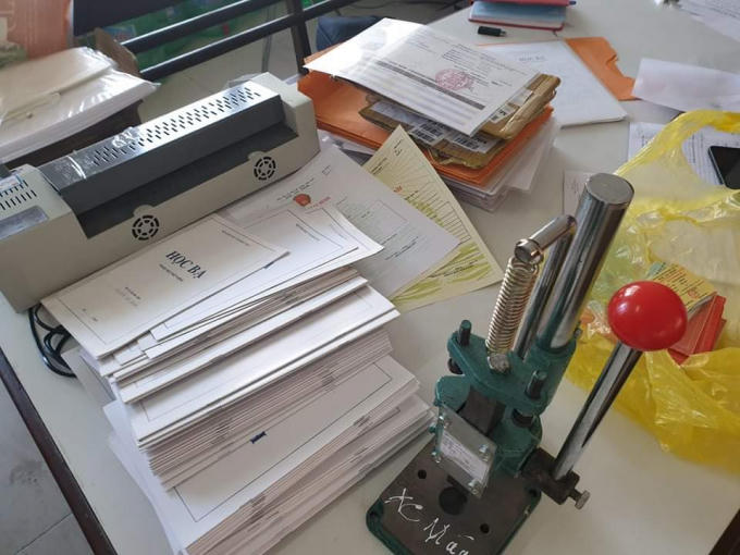 Công an thu giữ gần 400 văn bằng, tài liệu giả, 4 thẻ ATM, 41 con dấu tròn, 200 phôi giấy các loại, cùng dụng cụ để sản xuất tài liệu giả.
