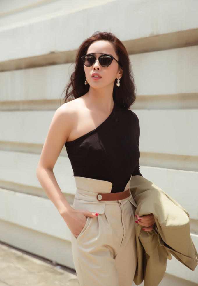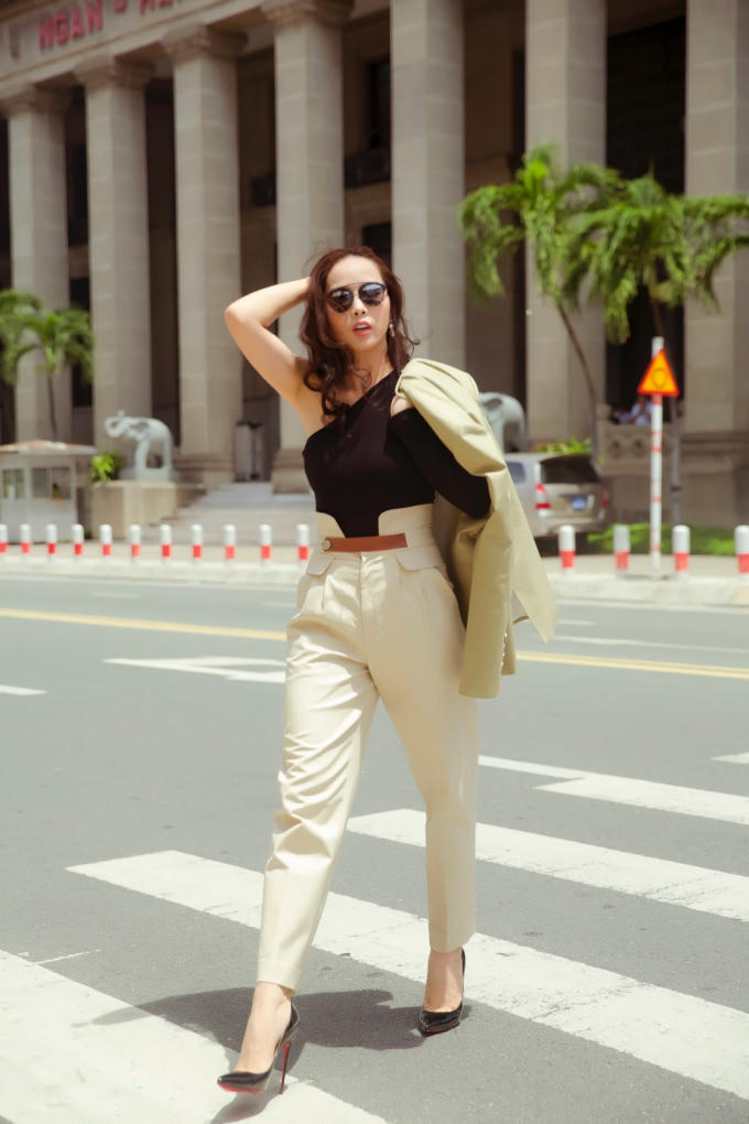 Trong bộ ảnh mới, Bella Mai biến đổi phong cách liên tục khi thì cá tính với sơ mi, quần ống rộng khi lại dịu dàng, đằm thắm với váy xoè chữ A... Nhưng điểm chung dễ nhận thấy là hầu hết những bộ trang phục mà Bella lựa chọn dạo phố đều có phần tay dài nhằm đánh lừa thị giác người nhìn, khéo léo che được phần bắp tay to vì tập võ.