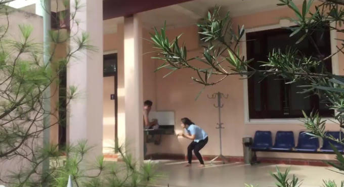 Tại đây đối tượng liên tục hò hét, lục tung sổ sách giấy tờ rồi lấy cả bảng tên của nhân viên ở đây mang vào cổ.