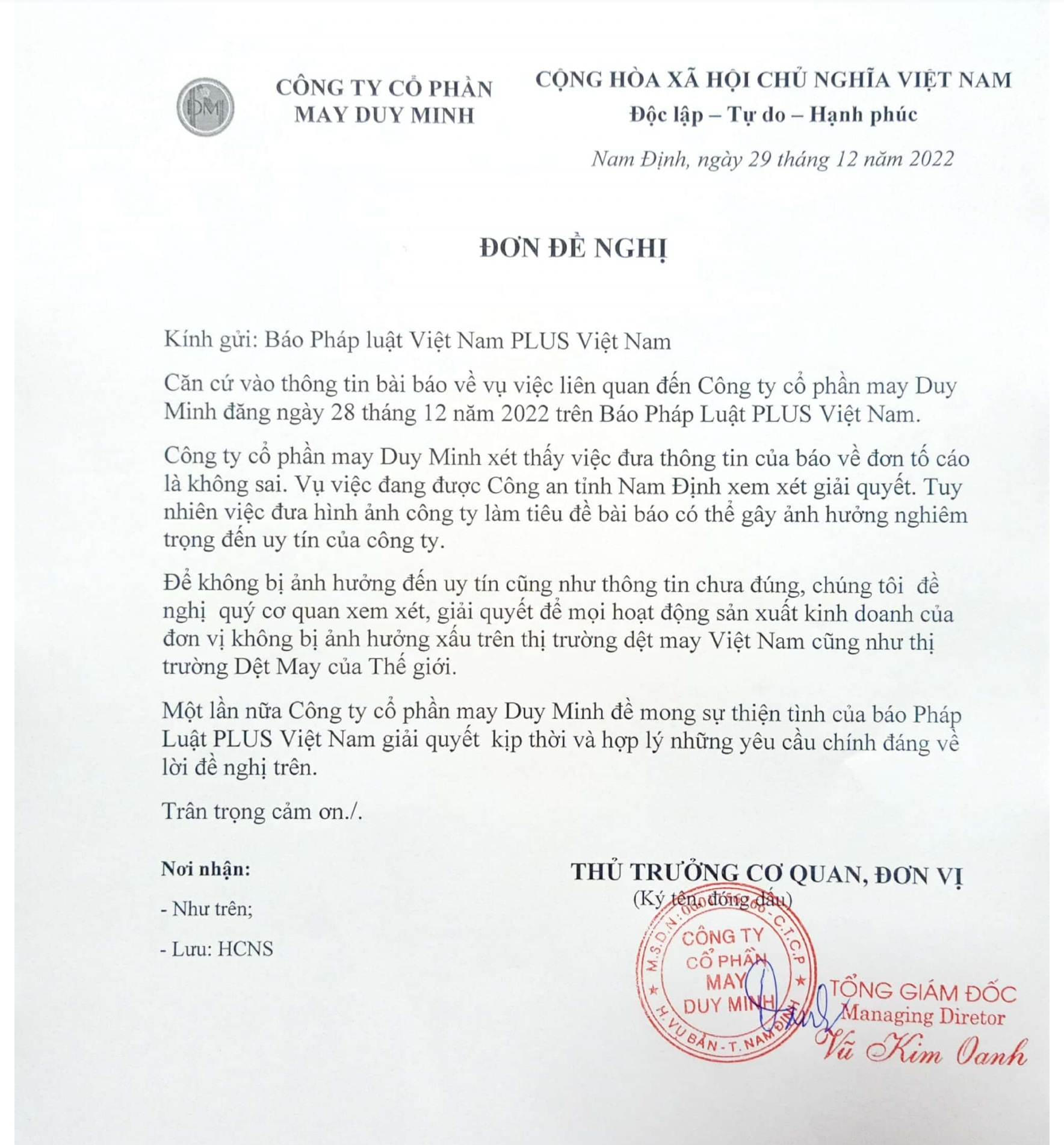 Đơn đề nghị của Công ty may Duy Minh.