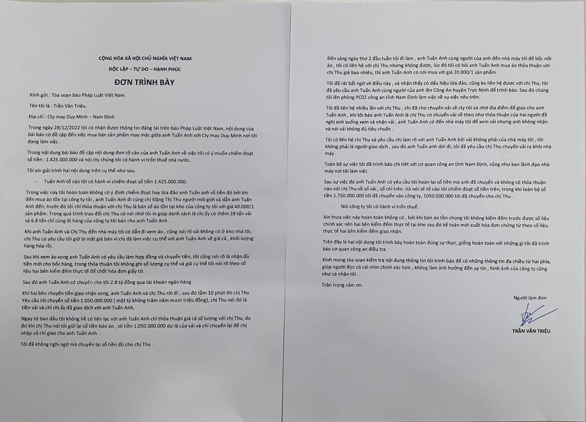 Ngay sau khi Báo Pháp luật Việt Nam đăng tải bài viết liên quan đến việc, ông Nguyễn Tuấn A làm đơn tố cáo ông Trần Văn Triệu có dấu hiệu lừa đảo trong việc mua bán quần áo.