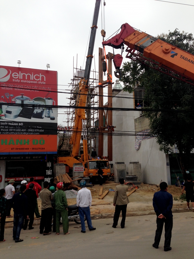 Để đưa được 22 cột gỗ cỡ lớn dựng đứng lên như thế, ông Nguyễn Văn Lân đã phải thuê đến 2 xe cẩu loại lớn, hoạt động liên tục đảm bảo tiến độ thi công. Vì ngôi nhà nằm ngay ngã 4 đường Trần Phú – Nguyễn Thị Minh Khai, nên lượng người qua lại rất đông. Hầu hết ai đi qua cũng phải ngước nhìn.