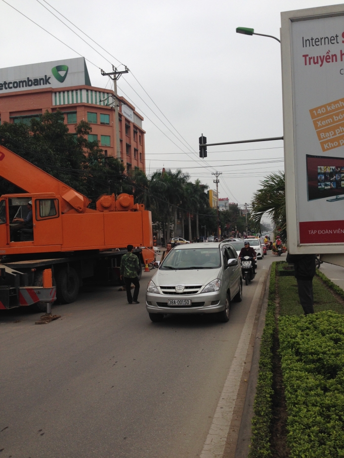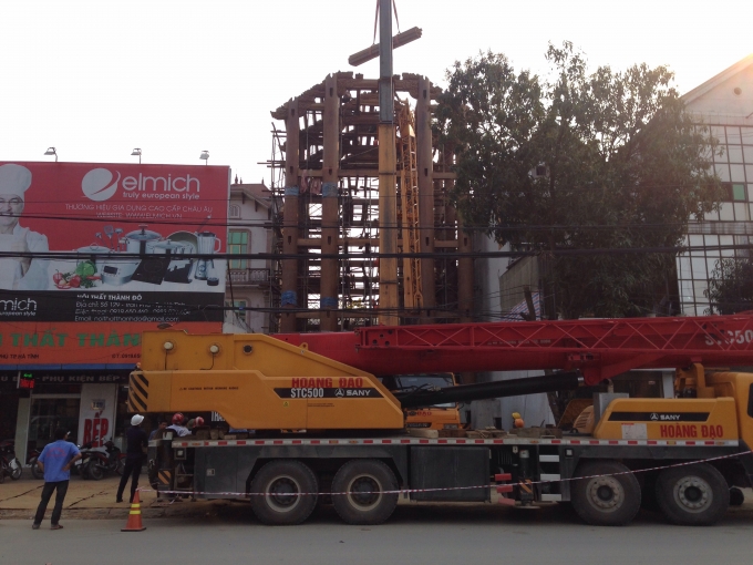 | Ngôi nhà gỗ 5 tầng đang được hình thành, luôn có những xe cẩu loại lớn túc trực xung quanh, mỗi khi cần cẩu hoạt động, lái xe thường căng dây và chóp nón bằng nhựa để cảnh báo người đi đường. |