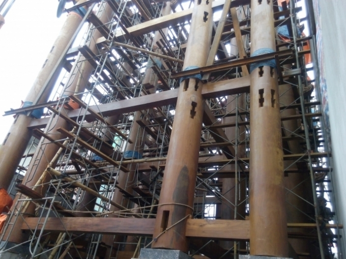 | Những cột gỗ cao chót vót từ ngày đầu mang về lắp ghép khiến người hiếu kỳ tập trung đến xem rất đông. |