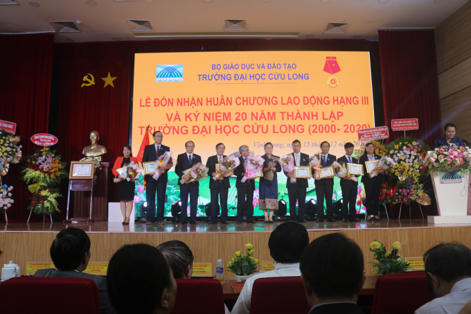Để đạt được thành tựu 20 năm thành lập, Trường Đại học Cửu Long vinh dự đón nhận Huân Chương Lao động Hạng III của Chủ tịch nước CHXHCN Việt Nam, Bằng khen của Thủ tướng Chính phủ nước CHXHCN Việt Nam. Bằng khen của Bộ Giáo dục và Thể thao, Bộ khoa học và Công nghệ nước Cộng hòa Dân chủ Nhân dân Lào và các phần thưởng của Bộ, Ngành, Trung ương và tỉnh Vĩnh Long cho tập thể và các cá nhân có nhưng thành tích to lớn đóng góp cho sự nghiệp giáo dục, đào tạo nguồn nhân lực.