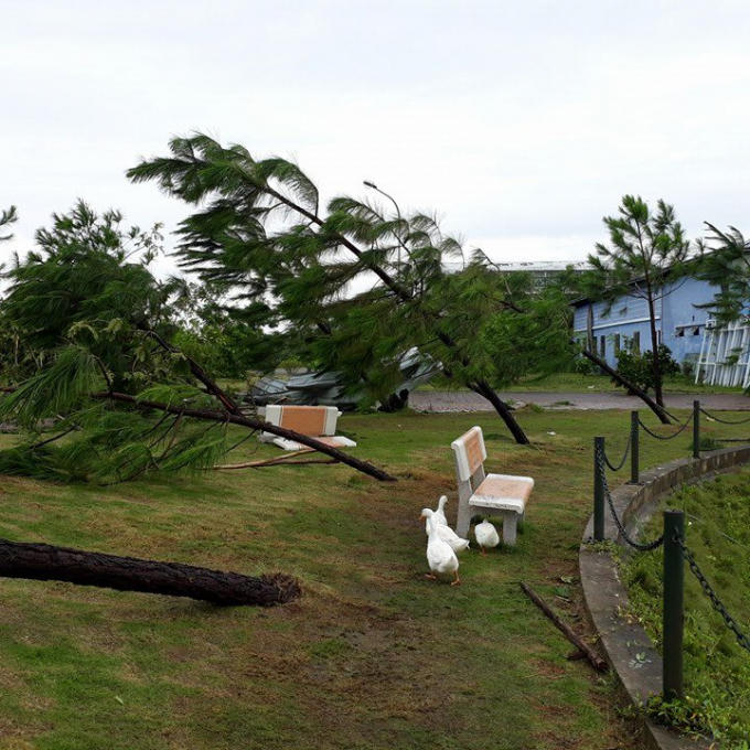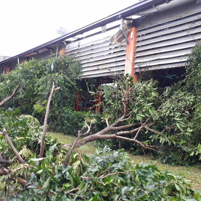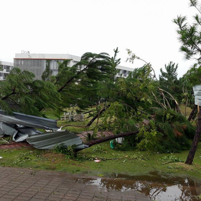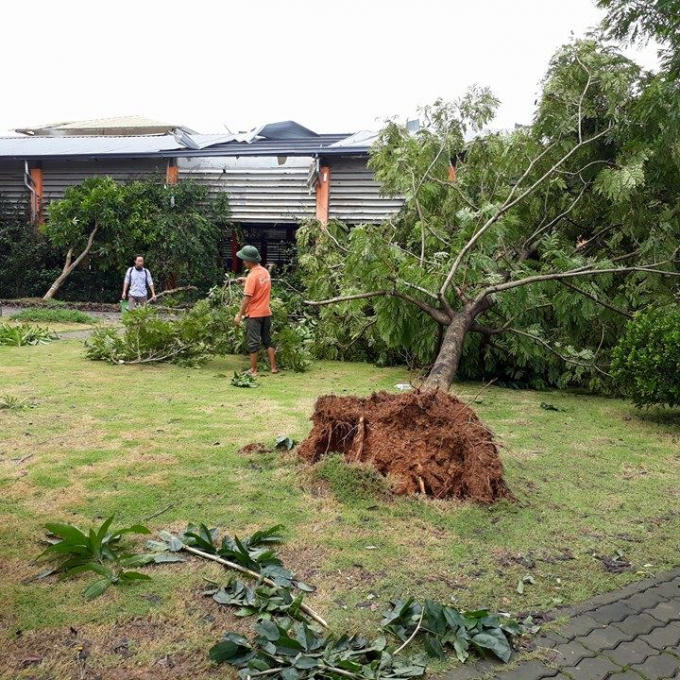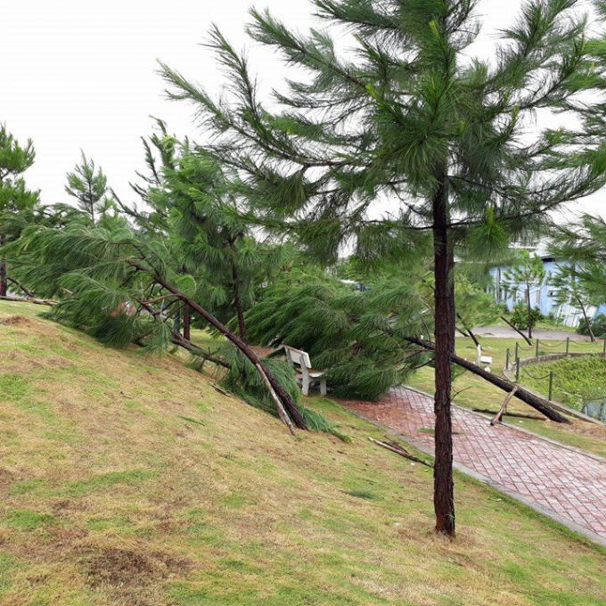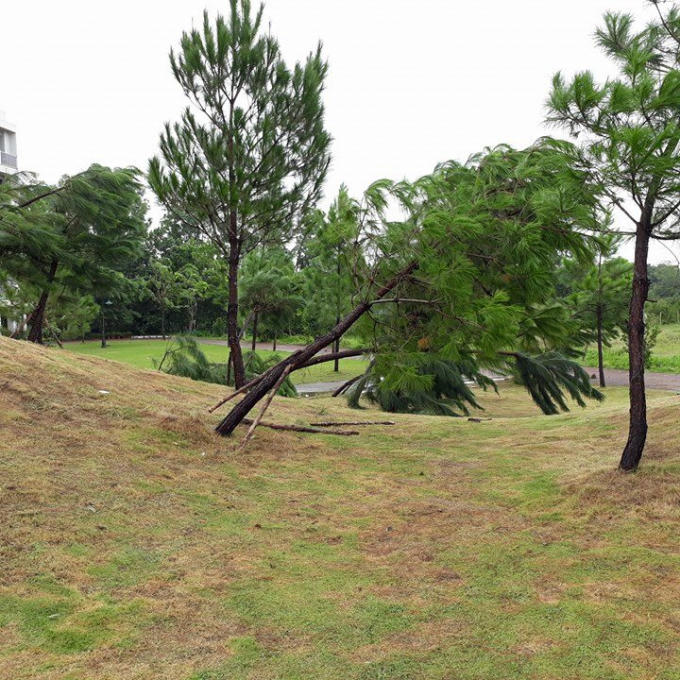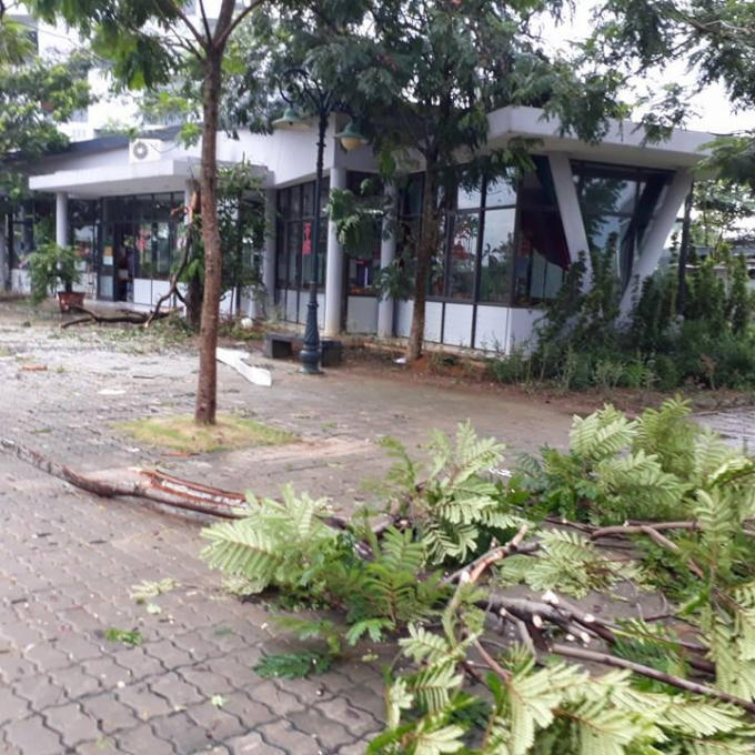 Trong buổi chiều ngày 10/10 nhiều cây trong khu vực sân trường, ký túc xá bị đổ rạp, nhiều cây bật gốc, gãy ngang thân.