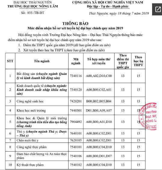 Tương tự, trường ĐH Nông lâm – ĐH Thái Nguyên cũng thông báo mức điểm sàn nhận hồ sơ xét tuyển hệ đại học chính quy năm 2019 theo phương thức xét điểm thi THPT quốc gia là 13 điểm và 15 điểm theo phương thức xét học bạ cho tất cả các chuyên ngành.