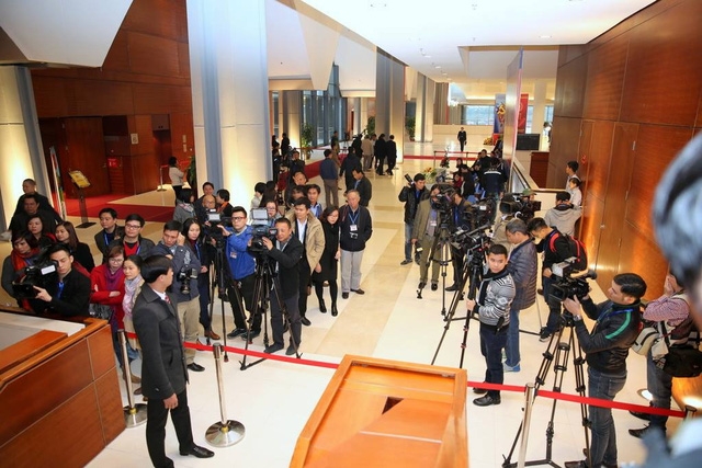| Rất đông phóng viên trong và ngoài nước chờ kết quả kiểm phiếu trước hội trường lớn. |