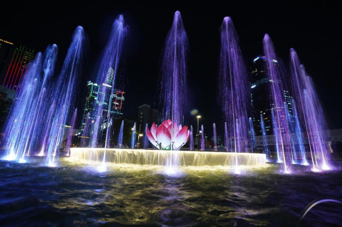 Đài phun nước được khánh thành tối 31/10/2019. Công trình này gồm hệ thống đài phun nước và ánh sáng nghệ thuật theo công nghệ Đức. Chính giữa đài phun là búp sen hồng được tạo tác bằng thủy tinh đặc biệt với hình dáng đang bung nở. Trang trí thêm cho đài phun là hệ thống ánh sáng được thiết kế để làm tăng thêm vẻ 'lung linh' cho cụm công trình khi đêm xuống. Tổng mức đầu tư cho công trình là 23 tỷ đồng.