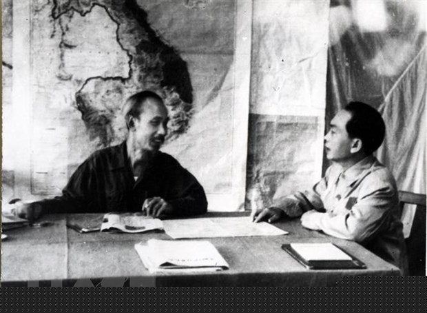 Thay mặt Trung ương Đảng và Chính phủ, Chủ tịch Hồ Chí Minh trực tiếp giao nhiệm vụ cho Đại tướng Võ Nguyên Giáp nghiên cứu kế hoạch tác chiến và mở Chiến dịch Điện Biên Phủ. (Ảnh: Tư liệu TTXVN)