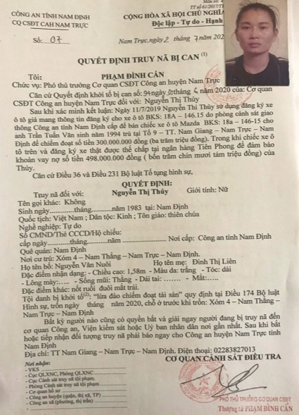 Quyết định truy nã đối tượng Thủy (Ảnh: Cơ quan công an).