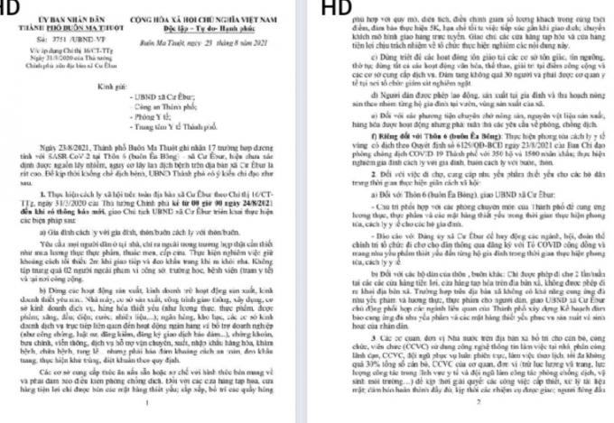 Văn bản chỉ đạo của UBND thành phố Buôn Ma Thuột về việc thực hiện Chỉ thị 16 của Thủ tướng Chính phủ trên toàn xã Cư Êbur, Thành phố Buôn Ma Thuột từ 0h ngày 24/8.