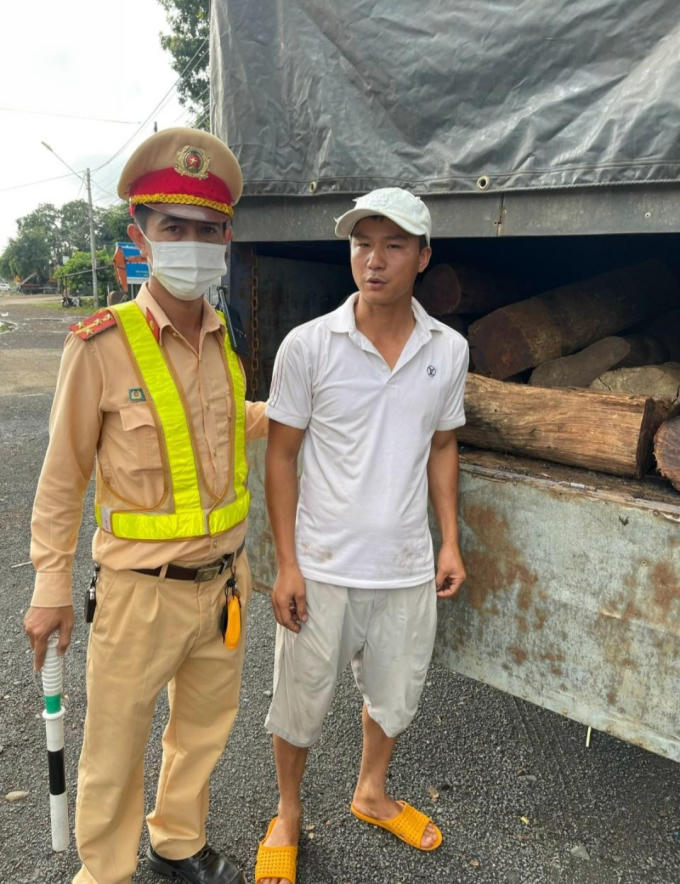 Tài xế và chiếc xe chở gỗ không nguồn gốc xuất xứ bị Công an lập biên bản tạm giữ( Ảnh: CACC)