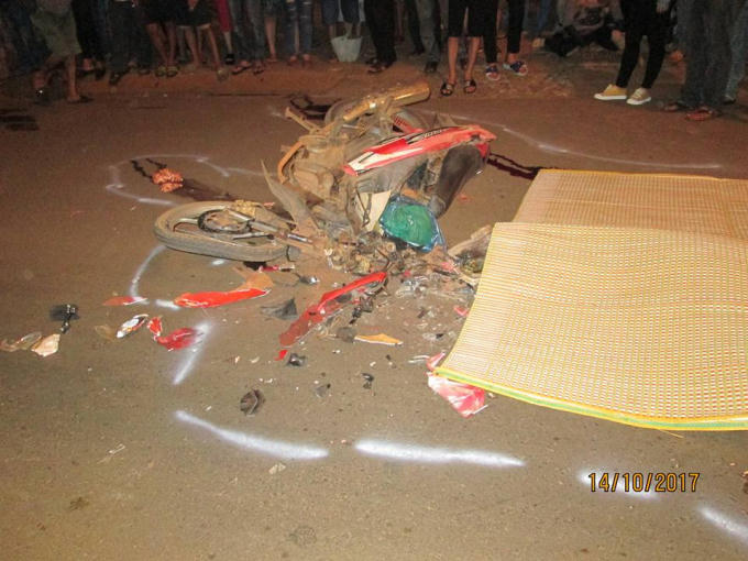 Tại hiện trường chiếc máy bị hư hỏng nặng, phần đầu chiếc xe máy bị vỡ nát.