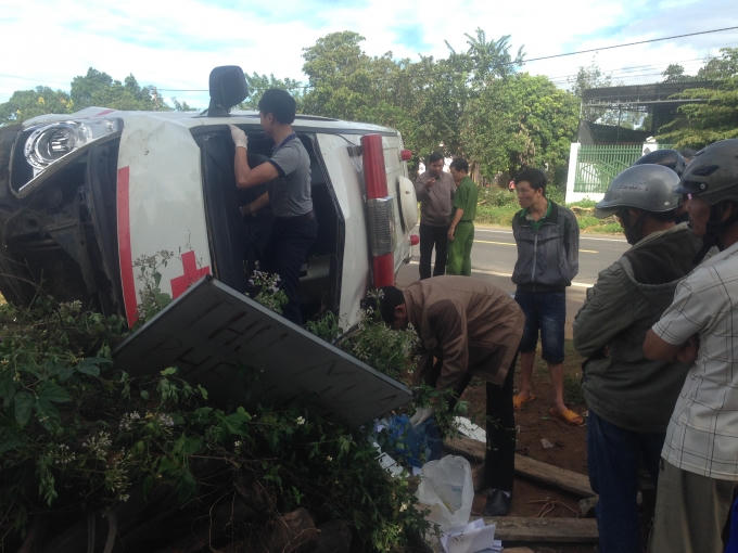 Xe cứu thương mang BKS-82B-0745 của Bệnh viện huyện Ngọc Hồi, Kon Tum đưa bệnh nhân bị tai nạn giao thông trước đó chuyển viện đã gặp tai nạn nghiêm trọng.