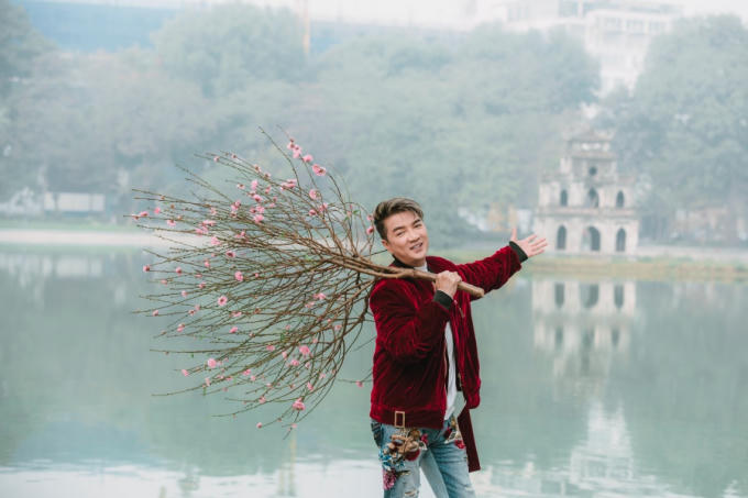 Đàm Vĩnh Hưng cầm nhành đào đi khắp các con đường ven Hồ Gươm để cảm nhận cái se lạnh cận Tết của miền Bắc.