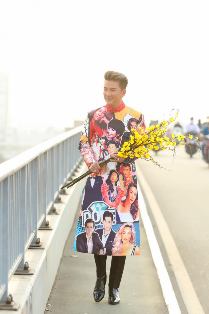 Mr Đàm nổi bật khi diện áo dài đầy đủ gương mặt của sao Việt đi giữa đường phố Sài Gòn.