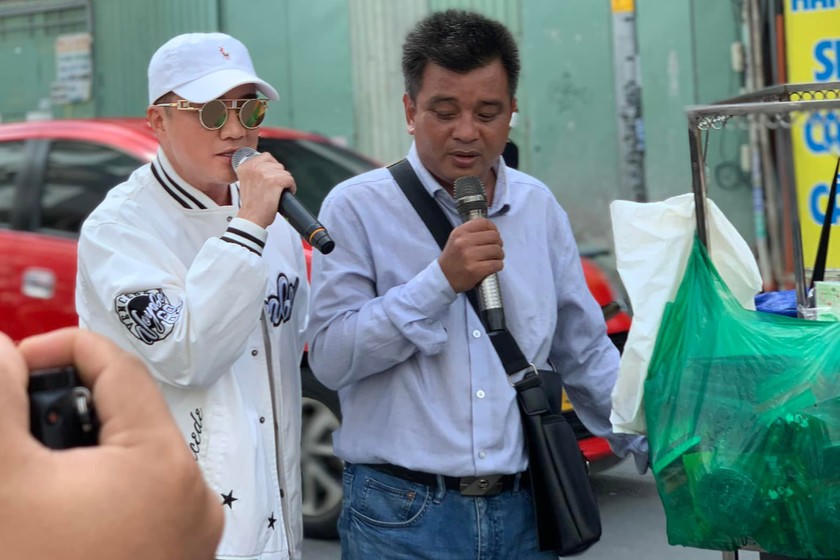 Hình ảnh Mr Đàm xuống đường “hát rong” cùng “bản sao khiếm thị”. Ảnh: NV.