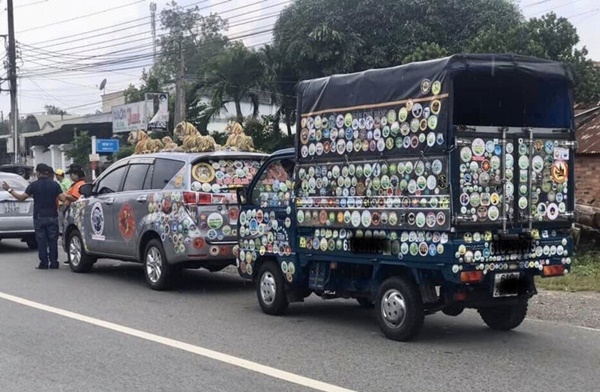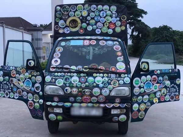 Một chiếc xe tải dán hàng chục loại logo, decal khác nhau trên xe. (Ảnh: HLX)