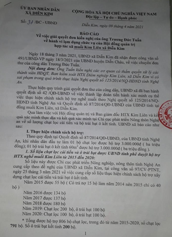 Theo báo cáo số 31/BC-UBND xã Diễn Kim, huyện Diễn Châu, Nghệ An về việc giải quyết kiến nghị của ông Trương Đức Tuấn về hành vi lạm dụng chức vụ của Hội đồng quản trị hợp tác xã muối Kim Liên.