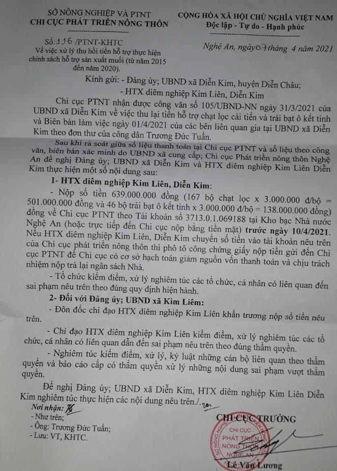 Văn bản của Chi cục phát triển nông thôn Nghệ An về xử lý vụ việc.