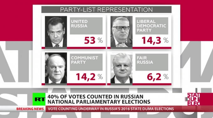 Reuters dẫn kết quả bầu cử sơ bộ từ Ủy ban bầu cử Nga cho thấy Đảng nước Nga thống nhất hiện dẫn đầu với 53% tỷ lệ ủng hộ, tiếp theo là Đảng Dân chủ Tự do Nga (LDPR) và Đảng Cộng sản Nga với tỷ lệ ủng hộ lần lượt là 14,3 % và 14,2 %. Đảng nước Nga công bằng xếp vị trí cuối cùng với 6,2 %.