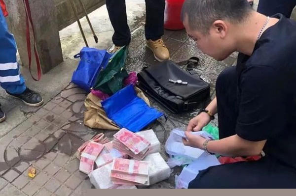 Sau khi đưa chiếc túi nặng lên bờ, chị mở ra thì phát hiện bên trong một lượng lớn tiền mặt và đồng hồ Longines đắt tiền. Qua kiểm đếm, số tiền mặt lên đến 600.000 nhân dân tệ (~2,1 tỷ đồng). Các tờ tiền được đóng thành cọc và không hề bị ướt dù trôi trên sông cùng chiếc túi.