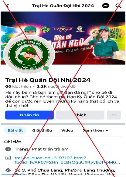 Ngày 9/5, thông tin từ Công an TP Hà Nội, thời gian vừa qua Công an thành phố đã cảnh báo thủ đoạn lừa đảo khi tham gia đăng ký các khóa học "Trại hè Kỹ năng - Học kỳ Công an nhân dân Nhí", "Trại hè Kỹ năng - Học kỳ Công an nhân dân", "Trại Hè Quân Đội", "Trải Nghiệm Quân Đội Hè"… trên mạng xã hội Facebook, tuy nhiên vẫn còn nhiều nạn nhân bị mắc bẫy.