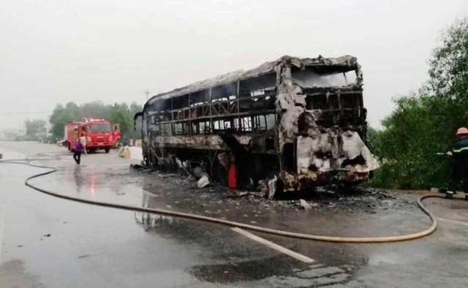Chiếc xe khách nhanh chóng bị lửa thiêu rụi trơ khung, nhiều hành lý và hàng hóa cũng bị thiêu rụi.