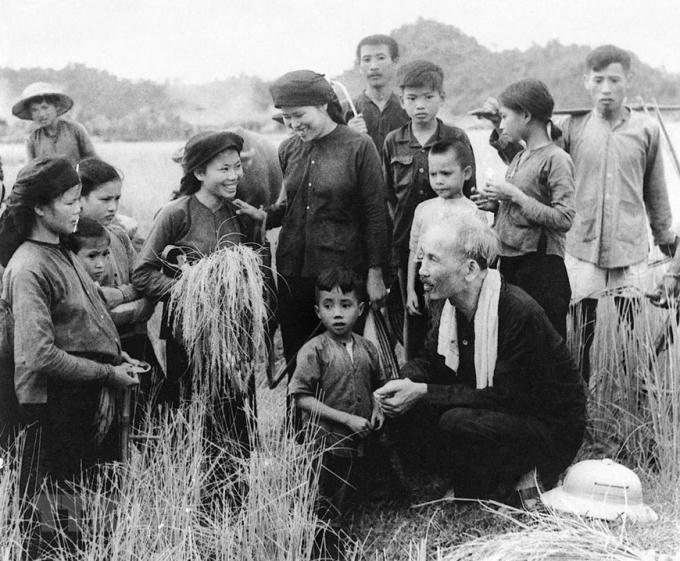 Chủ tịch Hồ Chí Minh thăm Hợp tác xã Hùng Sơn, huyện Đại Từ, tỉnh Thái Nguyên gặt mùa (1954).
