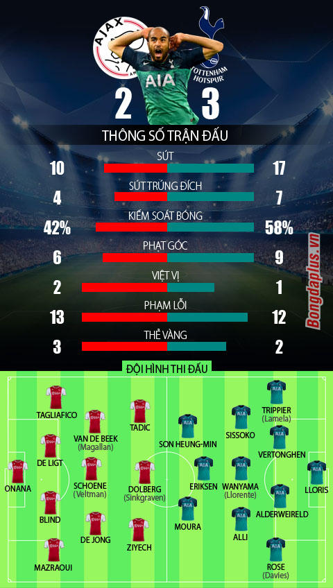 Khi mà Ajax không thể tận dụng được các cơ hội của mình thì sự nghiệt ngã của bóng đá đã xảy ra. Ở phút bù giờ thứ 5 cũng là phút bù giờ cuối cùng, Moura kết thúc một ngày thi đấu thăng hoa của mình với pha lẻn xuống rất nhanh và dứt điểm hiểm hóc bằng chân trái vào góc gần ấn định chiến thắng 3-2 cho Tottenham. Kết quả chung cuộc 2 đội hòa nhau 3-3 và Tottenham giành vé vào chung kết nhờ luật bàn thắng trên sân khách.